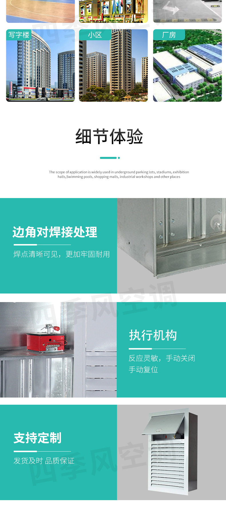 靖江市四季風(fēng)空調(diào)設(shè)備有限公司--消防排煙閥平時常閉;Dc24V電動開啟,手動開啟,輸出開啟信號;手動復(fù)位,電動復(fù)位。