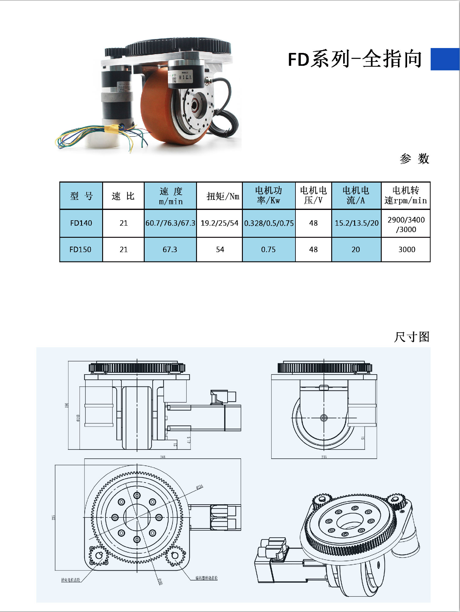FD系列舵輪組,全指向型。采用差速驅動輪組模塊,將減速機與驅動輪設計為一體,加外接直流電機,成為高度集成的機電一體化AGV行走驅動輪組組件。其結構簡單,性能可靠,便于安裝。
