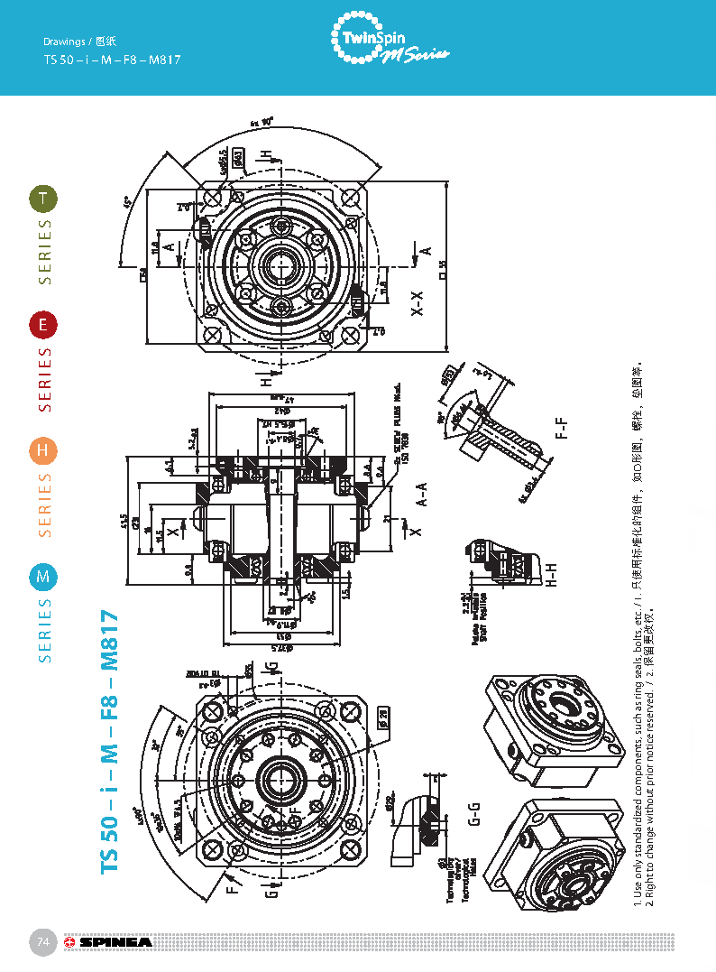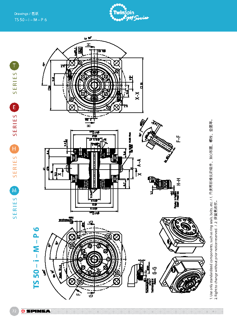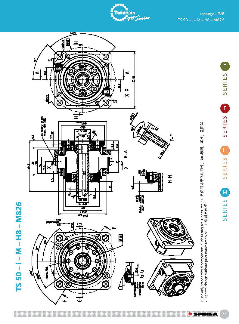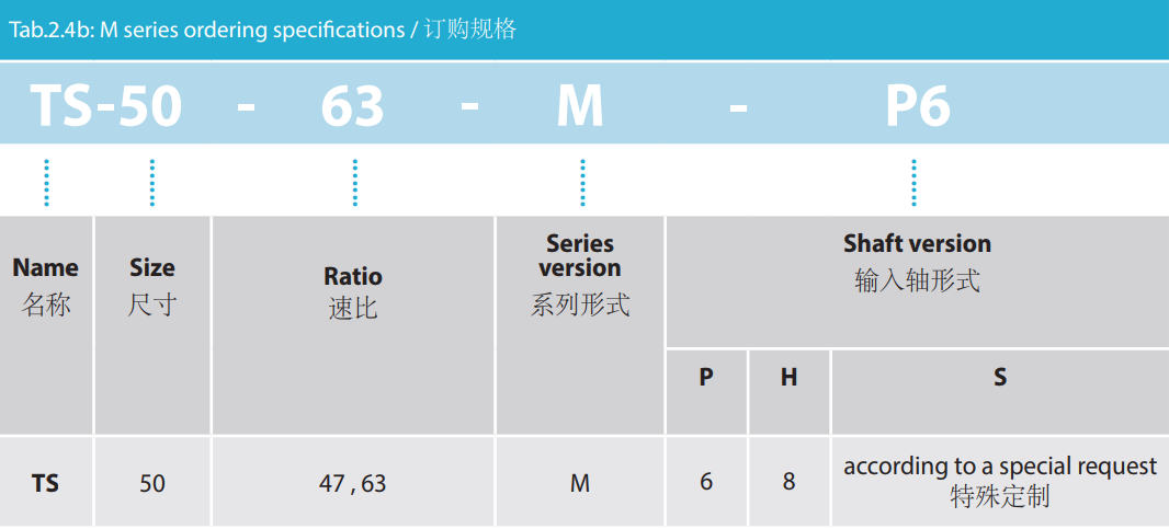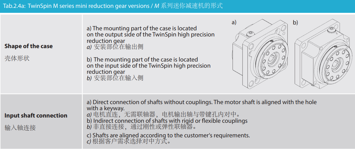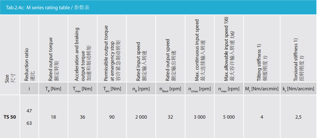 M 系列是最小型號的Twinspin高精度減速機,以TS50為代表。未來我們將推出更小的型號為M系列增加成員。 M系列減速機保留了SPINEA減速機所有的優點,我們可以驕傲的說,M系列代表了市面上同類型的最優秀的減速機。 減速機內注有終生免維護油脂,由輸出端的密封球軸承(2RS)保證油封;在輸入端也應用了同樣的軸承(輕微的潤滑油泄漏為容許現象)。SPINEA也可根據客戶的要求提供完全密封的減速機。 同其他系列相同,獨特的設計可以把負載直接安裝在減速 機輸出法蘭上,省去輸出端的額外軸承。